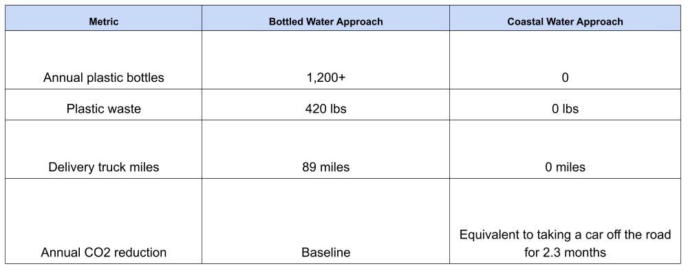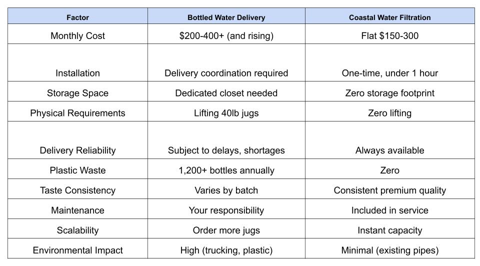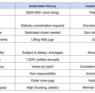 Let's talk ROI. You're already paying for water through utility bills. You're likely already paying $200-400/month for bottled delivery or purchases. Coastal Water typically costs the same or less than your current solution while providing better quality, zero waste, and eliminating operational headaches.